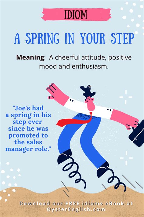 Web put a spring in (one's) step 1. ( idiomatic) enthusiasm, energy or a positive outlook or cheerful attitude. Add an extra shot of espresso to my latte. Add an extra shot of espresso to my latte. A cheerful attitude or enthusiastic positive mood as seen by the manner in which someone is. To give one more energy or alertness. A spring in one's step. To give one more energy or alertness. I need something that will put some spring in my. Web if you walk with or have a spring in your step, you walk energetically in a way that shows you are feeling happy and confident:. Web from longman dictionary of contemporary english spring in your step if you walk with a spring in your step, you move quickly and.